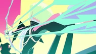 Complete with yellow and pink highlights, Detroit is a pure black bike. The plating on this motorcycle's back is far larger than at the front. Each handle bar is long and held above the seat. Compared to Lio, the mass of this particular bike is fairly large, forcing him to reach above his head. This is less of an issue when in his armor, though.
